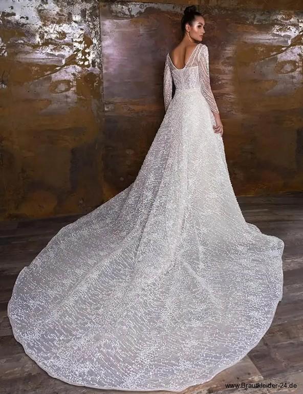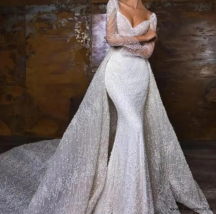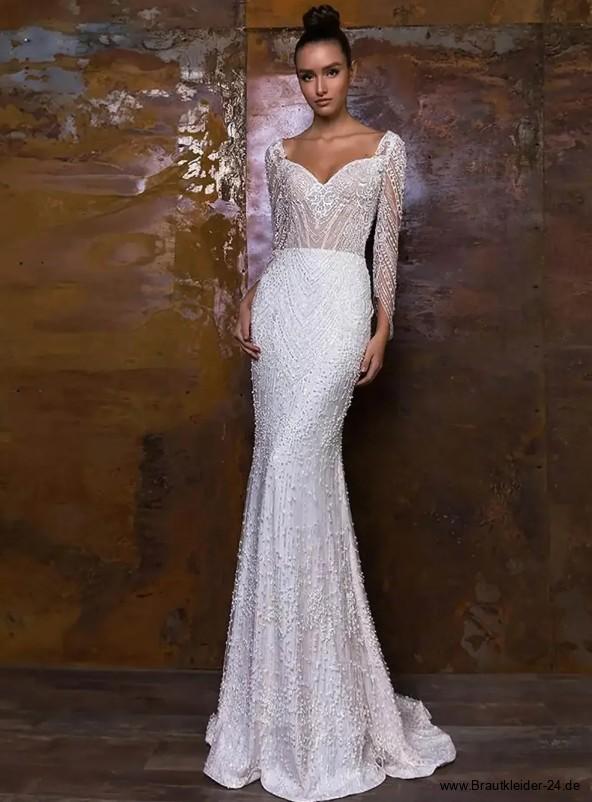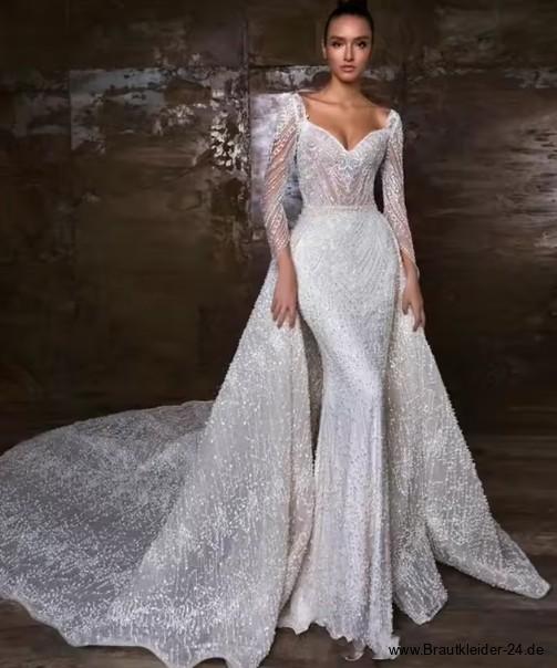 Langarm Meerjungfrau Brautkleid Hildegard mit Abnehmbarem Schleppe und Perlen