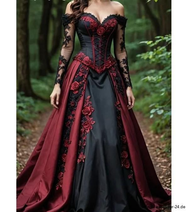 Schulterfreies Langarm Gothic Stil Brautkleid Isamara in Dunkelrot Schwarz mit Blumen